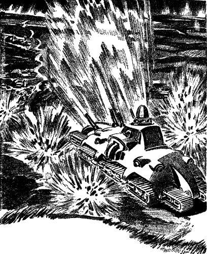 Where the tramp had been there was a single bit of bow-plating sticking up out of the surf, and a bunch of miscellaneous floating wreckage drifting sluggishly toward the beach. And there was a solid, rounded, metallic shape apparently quite as long as the original tramp had been. There was a huge armored tube across its upper part, with vision-slits in two bulbous sections at its end. There were gun-ports visible here and there, and already a monstrous protuberance was coming into view midway along its back, as if forced into position from within. Where the bow of the tramp had been there were colossal treads now visible. There was a sort of conning-tower, armored and grim. There was a ghastly steel beak. The thing was a war-machine of monstrous size. It emitted a sudden roaring sound, as of internal-combustion engines operating at full power, and lurched heavily. The steel plates of the tramp still visible above water, crumpled up like paper and were trodden under. The thing came toward the shore. It slithered through the shallow sea, with waves breaking against its bulging sides. It came out upon the beach, its wet sides glittering. It was two hundred feet long, and it looked somehow like a gigantic centipede.