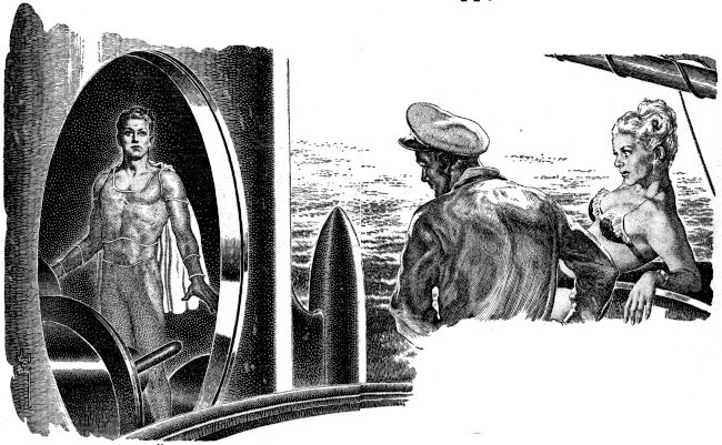 It was not Dusty Britton, lazing easily near the wheel of the schooner, keeping the helm steady with his left foot because his hands were occupied with a drink on one and a cigarette in the other. It was Barbara Crandall, lying on the cabin on a blanket. Her ankles were crossed and the arch of the upper foot was high and graceful. One thigh, slightly higher than the other, glinted from the sunshine, dark tan. Her breasts pointed at the sky, molded in dazzling white that contrasted sharply against the healthy, animal tan of her flat tummy. There were many more square feet of healthy hide showing than there were of the white shark-skin affair she wore, and Scyth approved of the view.